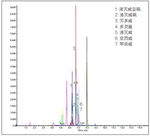 圖2 添加水平為0.05mg/kg大米中氨基甲酸酯類農藥多殘留檢測色譜圖